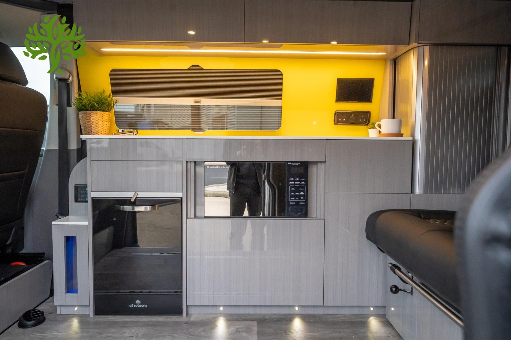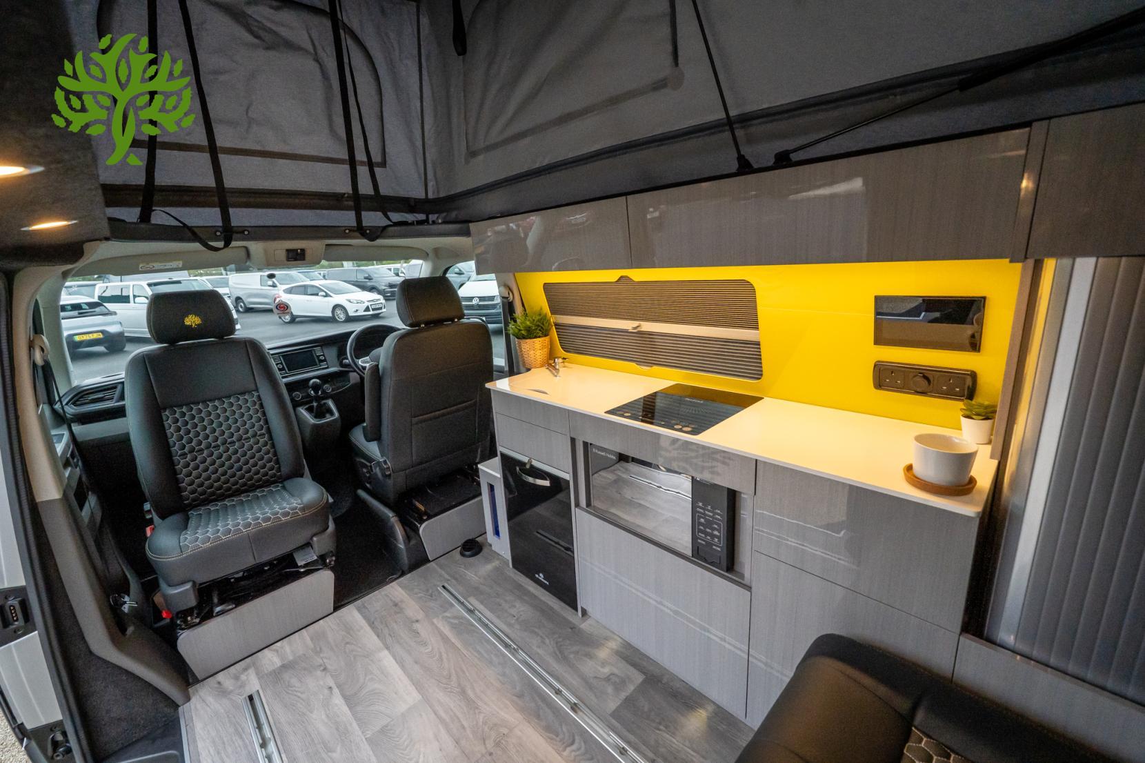 Step inside to discover a luxurious interior featuring full leather upholstery, providing both comfort and elegance. The campervan comfortably seats five and includes five doors for easy access. The thoughtfully designed living space is equipped with modern amenities, including air conditioning for those warm summer days, Apple CarPlay for seamless connectivity, and cruise control for relaxed driving on long trips.
