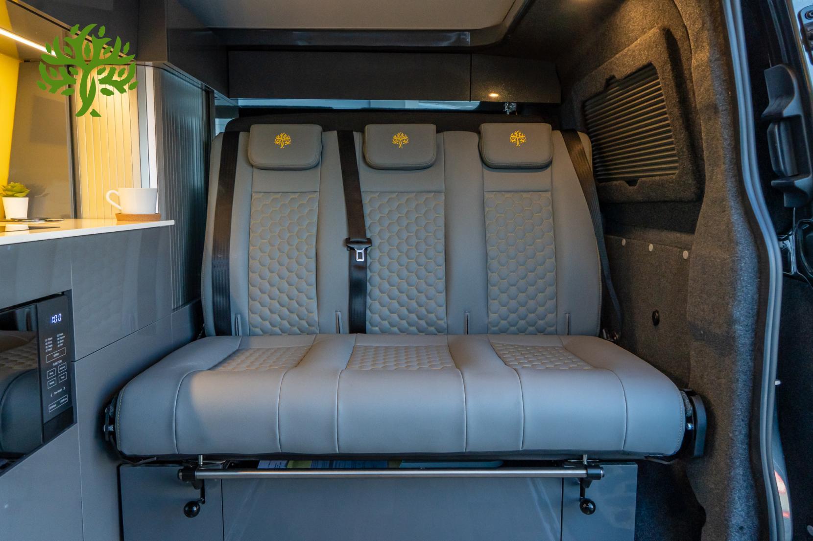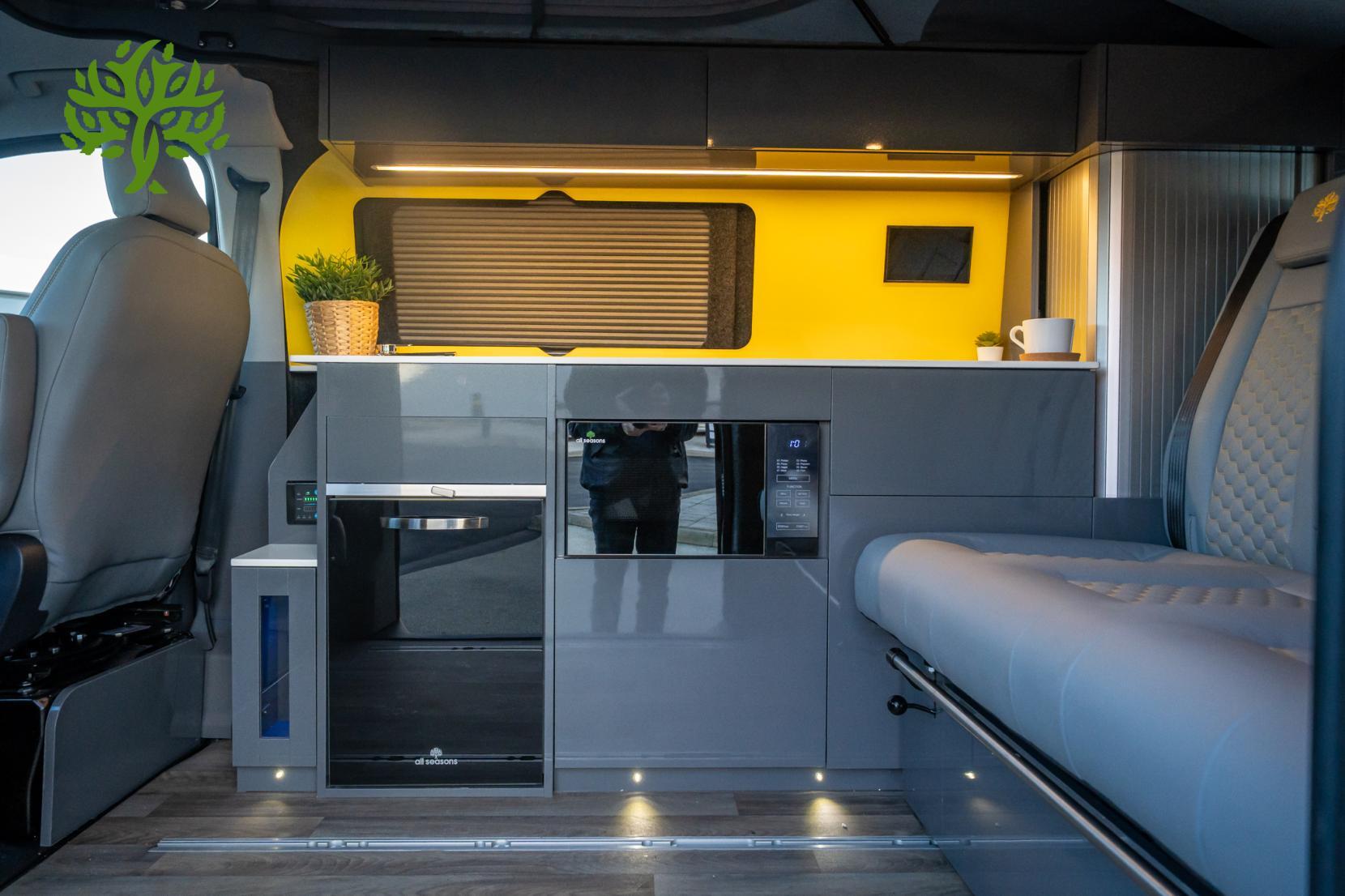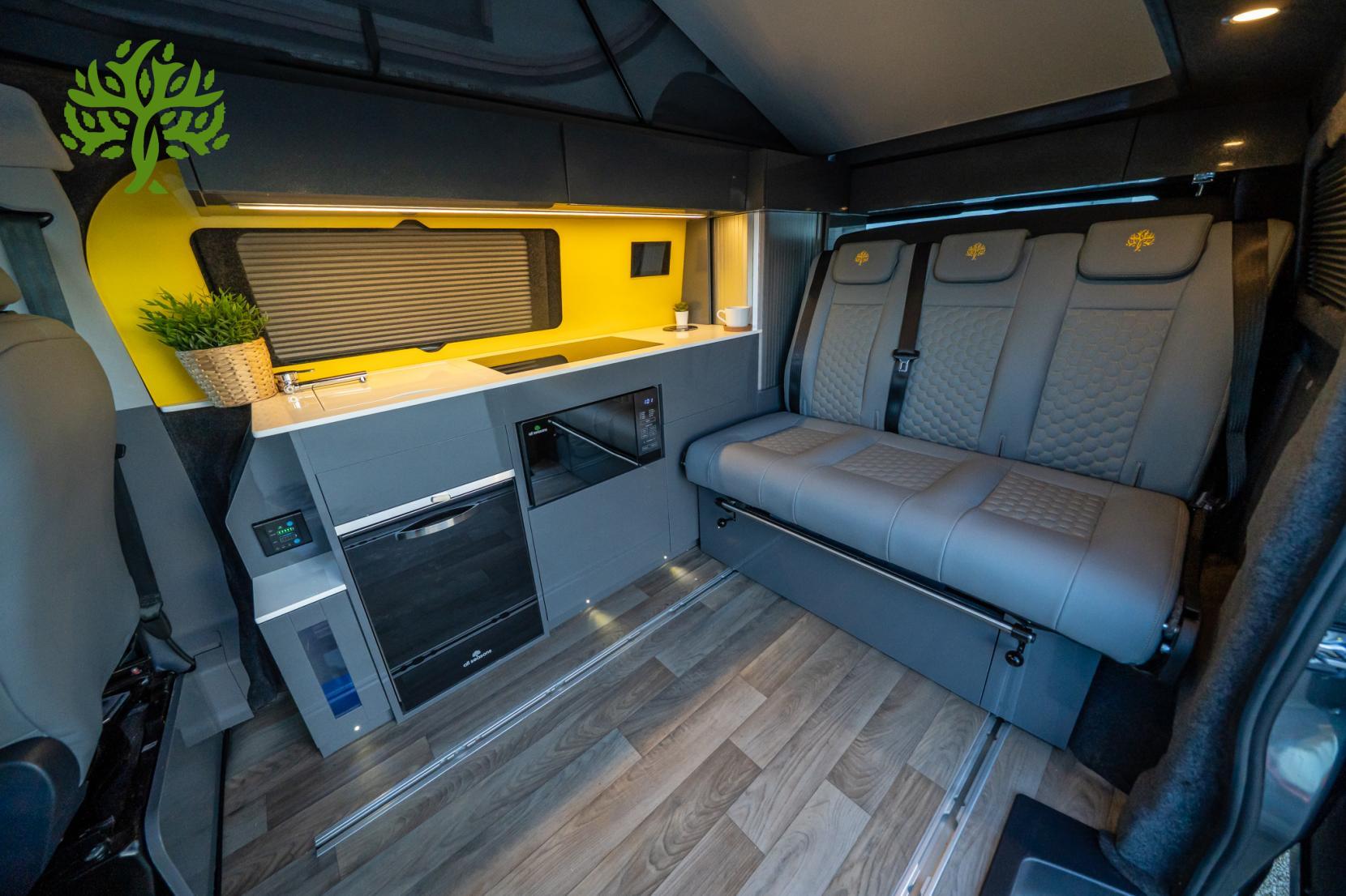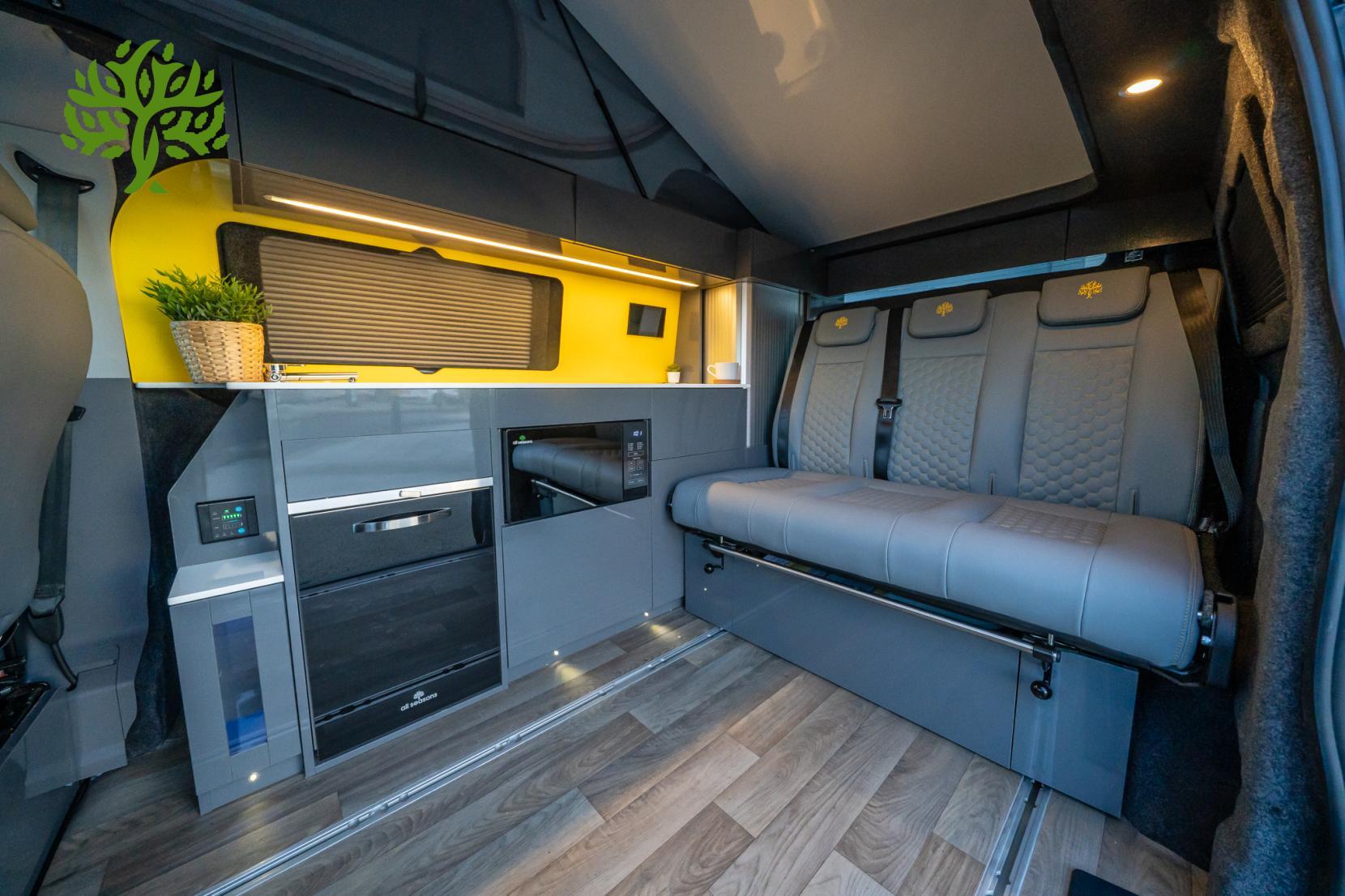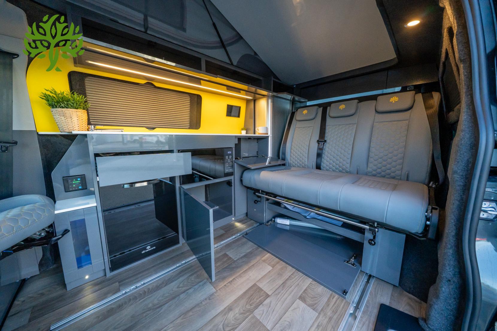 But wait, there’s more! This campervan is fully equipped for all your glamping needs. The Reimo Easy Fit pop top gives you extra headroom and sleeping space, while the Reimo sliding bed ensures you’ll have a comfy place to crash after a long day of exploring. And with a 230AH lithium battery and a 3,000W inverter, you can power all your gadgets and appliances without a hitch. Whip up a meal on the induction hob, enjoy hot water for your morning brew, and kick back with the heated seats after a chilly night under the stars.