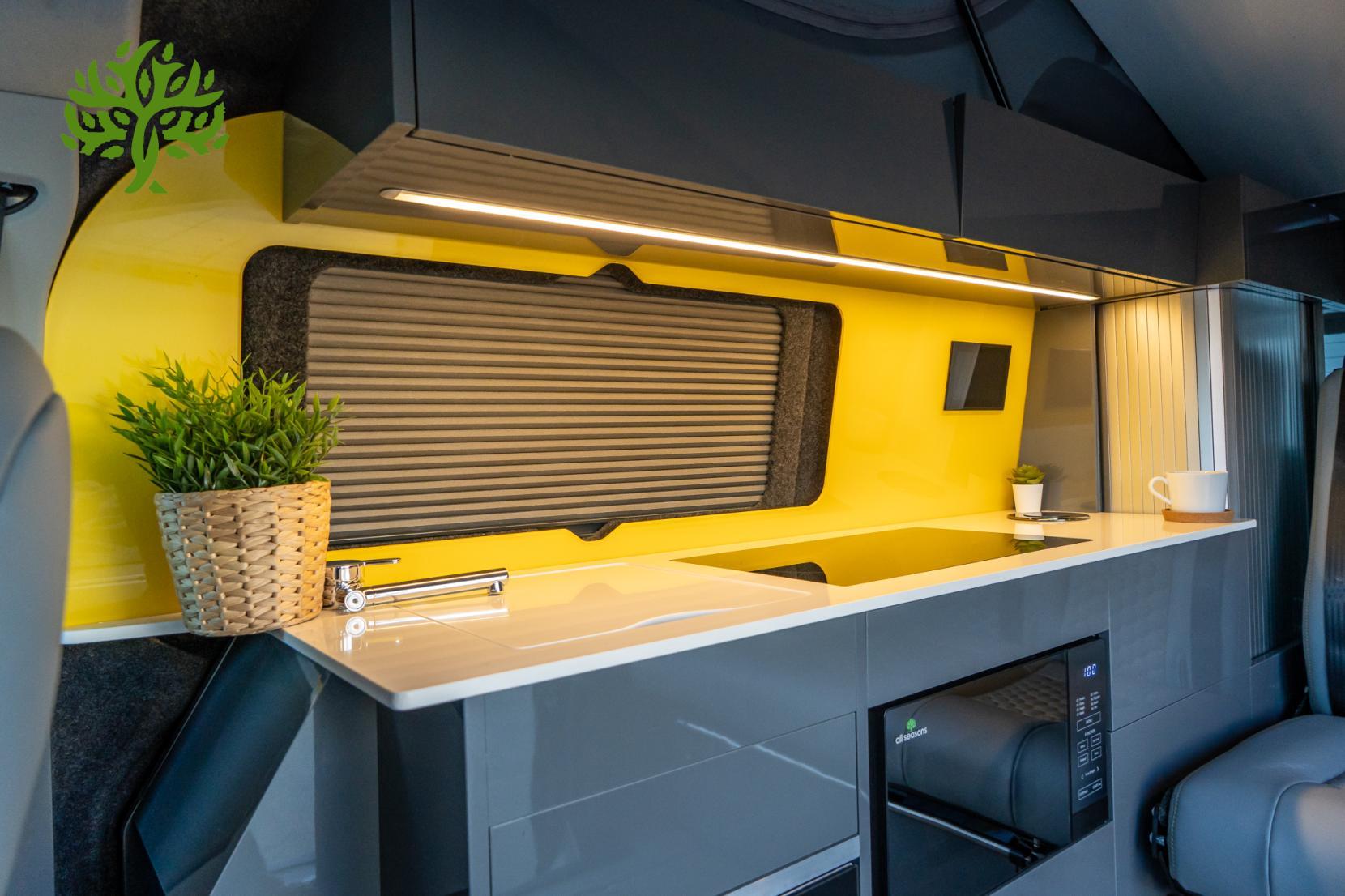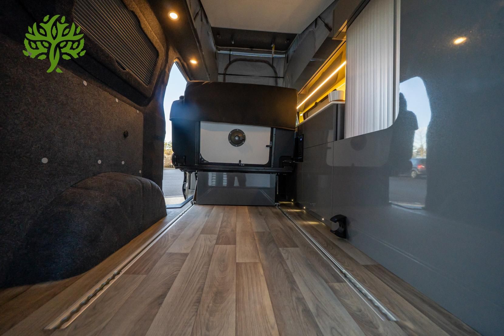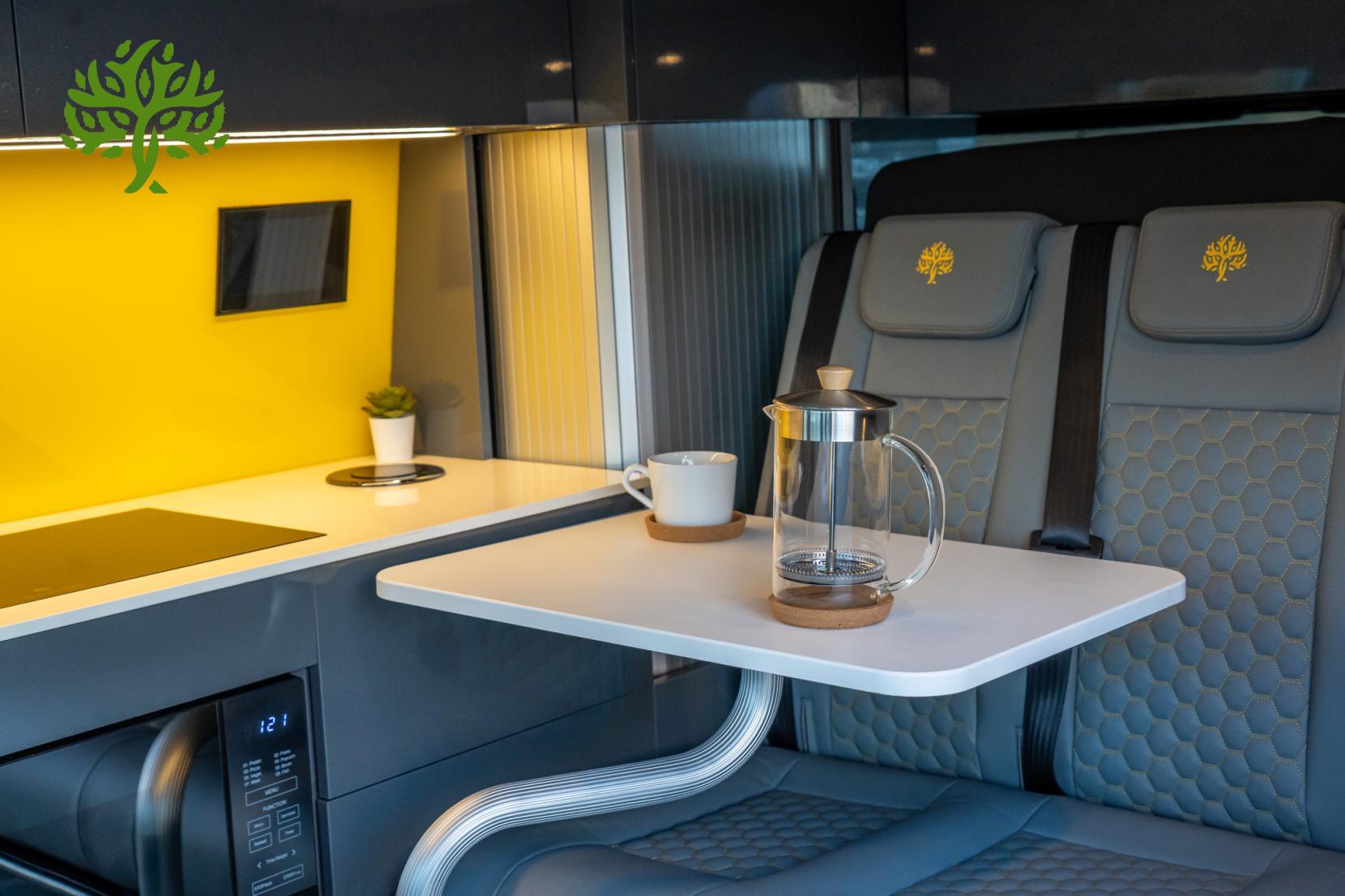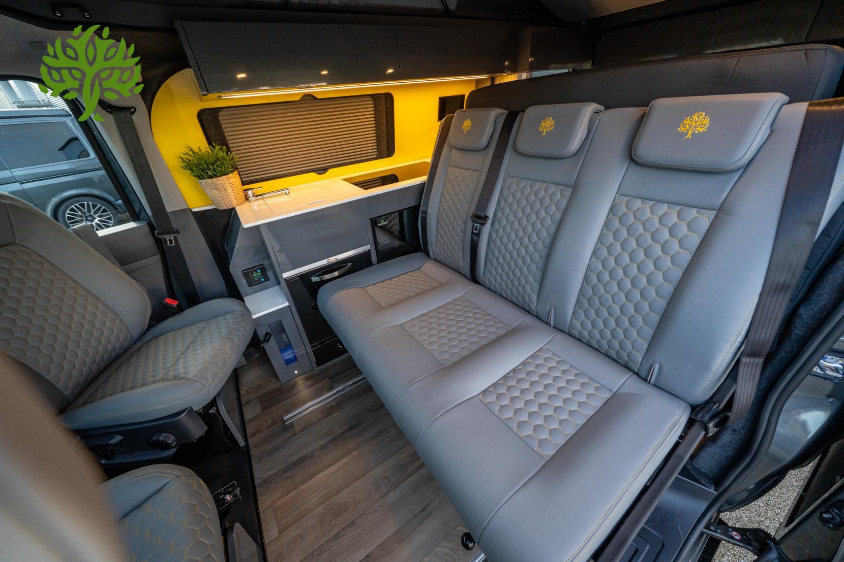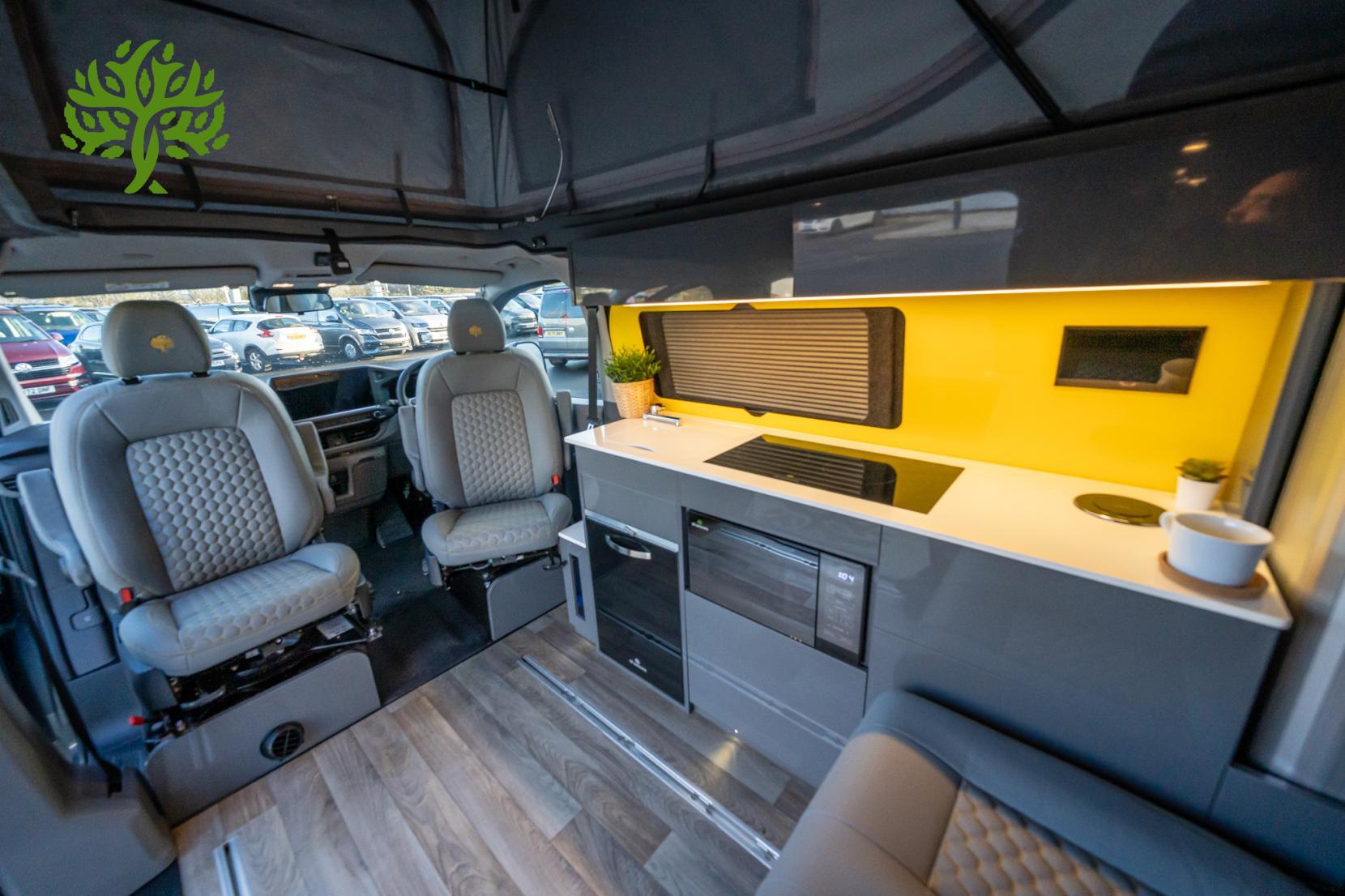 But wait, there’s more! This campervan is fully equipped for all your glamping needs. The Reimo Easy Fit pop top gives you extra headroom and sleeping space, while the Reimo sliding bed ensures you’ll have a comfy place to crash after a long day of exploring. And with a 230AH lithium battery and a 3,000W inverter, you can power all your gadgets and appliances without a hitch. Whip up a meal on the induction hob, enjoy hot water for your morning brew, and kick back with the heated seats after a chilly night under the stars.