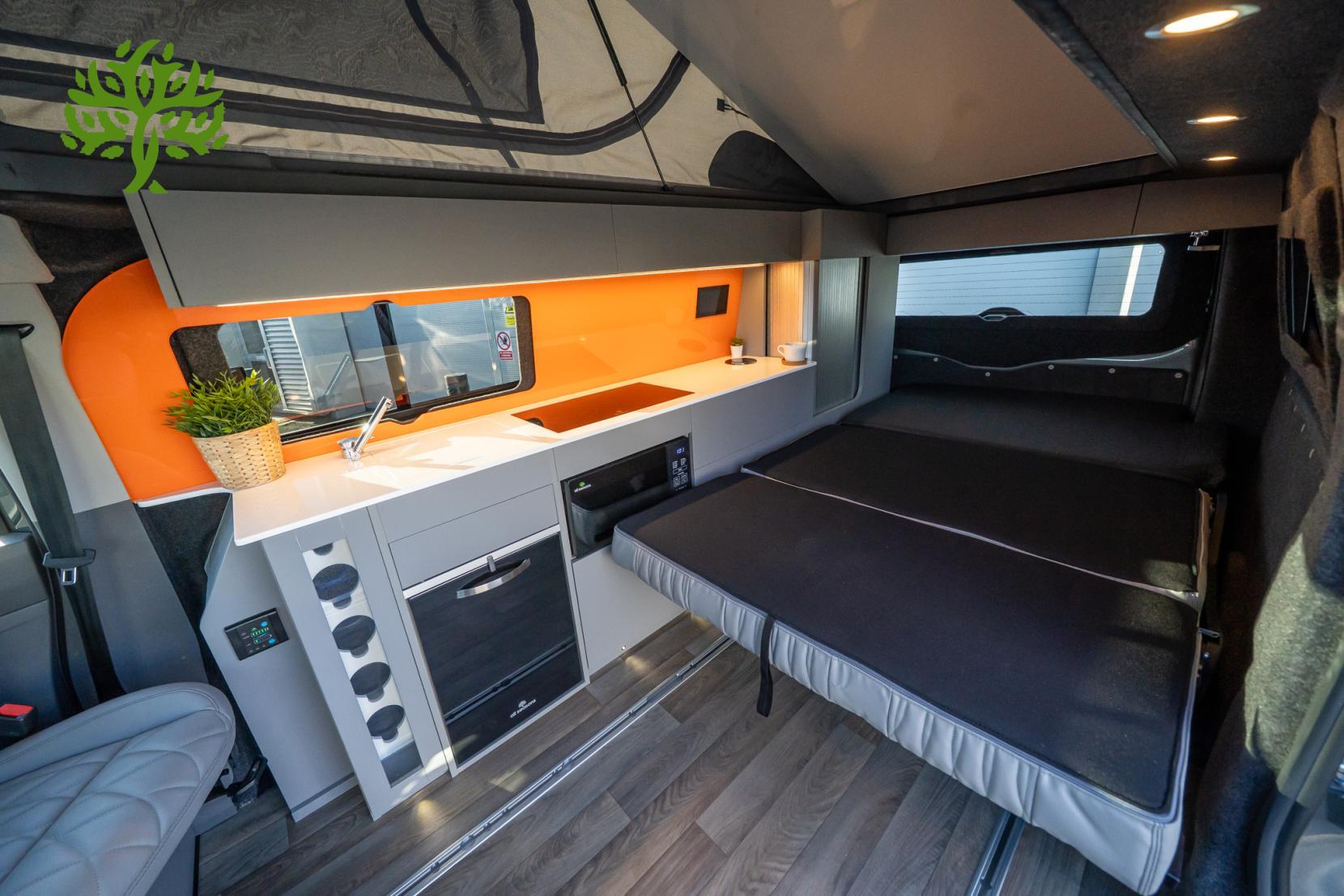 This campervan is also equipped with modern tech to keep you connected and safe on the road. With a sat nav to guide your travels and a reversing camera to help you park with ease, you’ll feel confident wherever you go. The LED lights not only look great but also provide excellent visibility, while the lithium battery and 3,000W inverter mean you can power your devices and enjoy the comforts of home, including an induction hob for cooking up delicious meals.