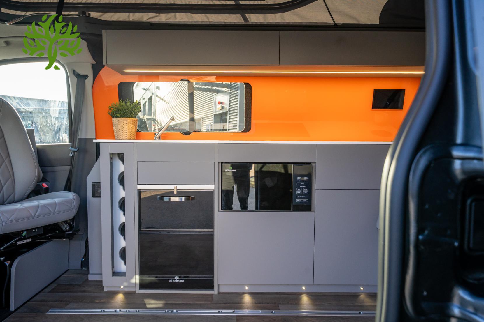 Step inside, and you’ll find a spacious interior that comfortably seats five, complete with full leather upholstery that adds a touch of luxury. The Reimo Easy Fit pop-top roof gives you extra headroom and sleeping space, while the Reimo sliding bed ensures you can rest easy after a long day of exploring. And let’s not forget the heated single captain seats that make every journey a pleasure, no matter the weather.